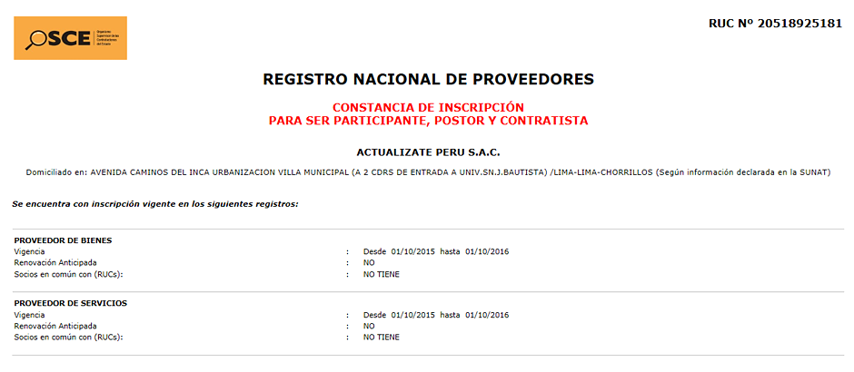 Actualízate Perú S.A.C., ha sido incorporado al Registro Nacional de Proveedores, participando de las contrataciones con Entidades del Estado Peruano a través del Portal de Convenio Marco de Computadoras, Monitores, Laptops, Proyectores, Scaneres y Workstations; lo que permitirá a nuestros clientes del sector gobierno realizar las adquisiciones de estos equipos de manera más rápida.